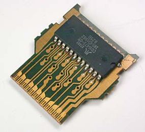 The chips were attached to a small printed circuit board (PCB) that also connected to the joystick ports, cartridge connector, power supply and video output. Games consisted of software encoded on ROM chips and housed in plastic cartridges. The ROM was wired on a PCB that had a series of metal contacts along one edge. These contacts seated into a plug on the console's main board when a cartridge was plugged into the system. When power was supplied to the system, it would sense the presence of the ROM and load the game software into memory.